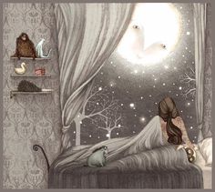 Un second rideau s'écarta, une seconde fenêtre s'ouvrit et l'on vit apparaître le visage de Madame Peregrine, elle était coiffée d'un ravissant bonnet de mousseline et de dentelle, noué d'un ruban rose. Son petit visage déjà fané paraissait bien plus jeune sans rouge ni poudre; en fait, Madame Peregrine avait l'air si jeune que Tabitha en faut toute surprise. On ne lui aurait pas donné plus de quinze ans.